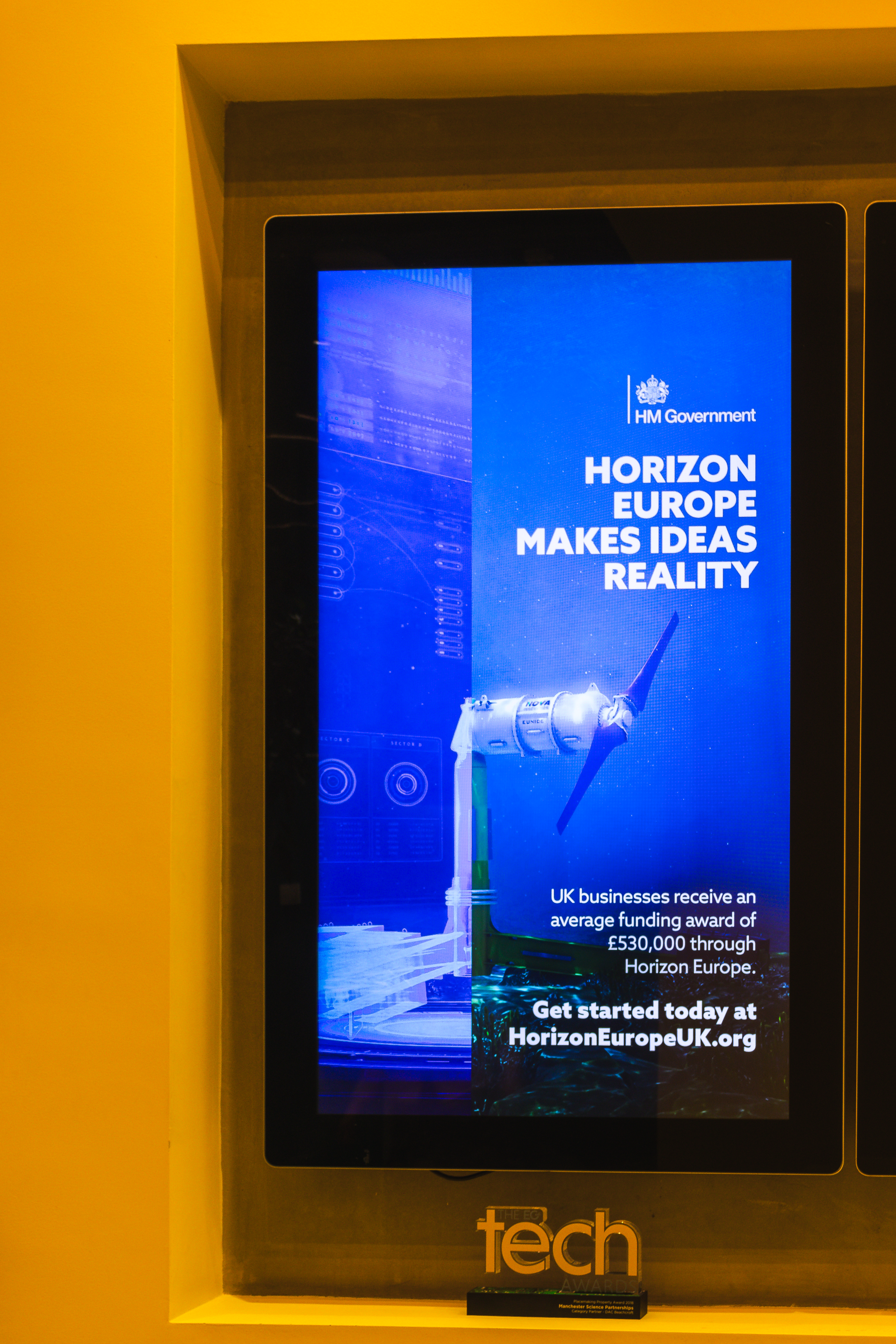 Images attached: New UK Government Horizon Europe advertising on display at the Bright Building, Manchester Science Park (credit: Bruntwood SciTech).